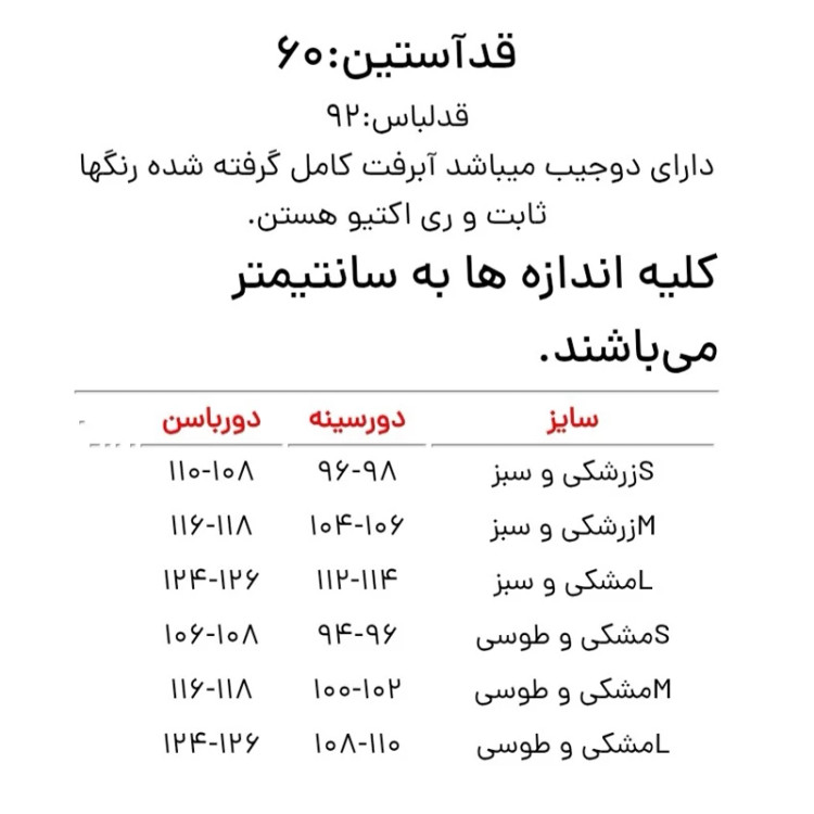 مانتو الیاف طبیعی گلدوزی شده مدل میخک سه رنگ سه سایز مانتو دانشجویی اسپرت میخک دو طرف جیب دارد. مانتو جلو بسته مشکی مناسب دانشگاه و محل کار الیاف طبیعی پنبه بدون آبرفت قواره کارها متفاوته. جهت اطمینان از سایز درست، حتماً عرض سینه یکی از مانتوهای خودتون رو اندازه بگیرید و ضربدر دو کنید، سپس با جدول راهنمای سایز در عکس آخر مقایسه کنید. لطفا قبل از ثبت سفارش از موجودی سایز و رنگ موردنظرتون مطمئن شوید. نحوه شستشو: به صورت پشت و رو داخل ماشین لباسشویی بیندازید و با آب سرد بشویید. برای شستشو از شویندههای آنزیمدار استفاده نکنید. خشککن و اتوی ملایم آسیبی به لباس نمیزند. اتو را مستقیم روی قسمتهای چاپی نگذارید.