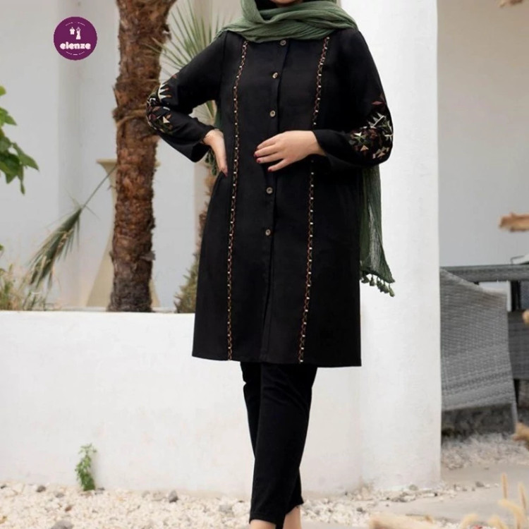 مانتو اداری مشکی بلند کرپ فاستونی مدل آسنا