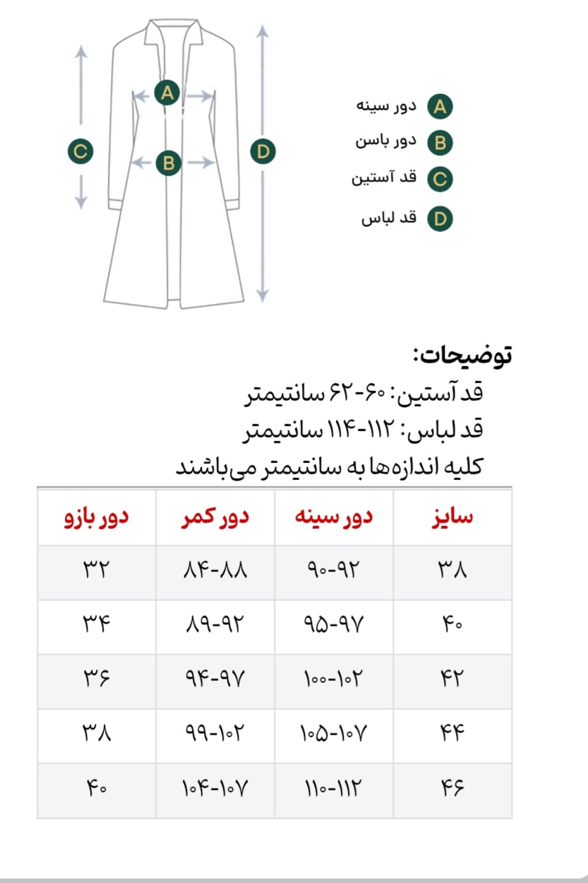 جهت انتخاب سایز، عرض سینه یکی از مانتوهای خودتون را اندازه بگیرید و ضربدر دو کنید، سپس با جدول راهنمای سایز در عکس آخر مقایسه کنید.